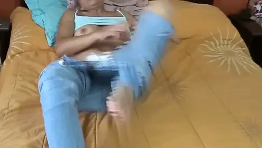 Sehr aufgeregte reife schönheit zieht ihre jeans runter, um ihre haarige muschi zu zeigen und zu masturbieren